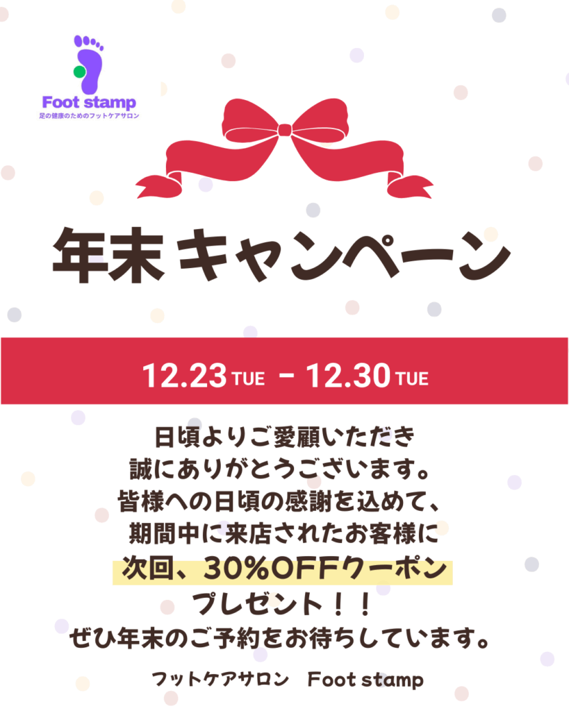 年末キャンペーン 2025年11月27日 最終更新日時 : 2025年11月27日 Tanaka Mayumi 初めての試みです! キャンペーン中にご予約いただいた方は、次回から使える「30%OFFクーポン」をプレゼント☆初回のお客様は、「20%OFF」と次回ご予約も「30%OFF」になりますよー。当店人気No1のメニュー トータルケア90分をぜひこの機会にお試しくださいませ。 期間中の営業日をご確認の上、ご予約をお願いいたします。 皆様からのご連絡、お待ちしていまーす!! \ 最新情報をチェック /